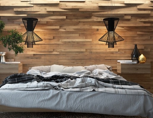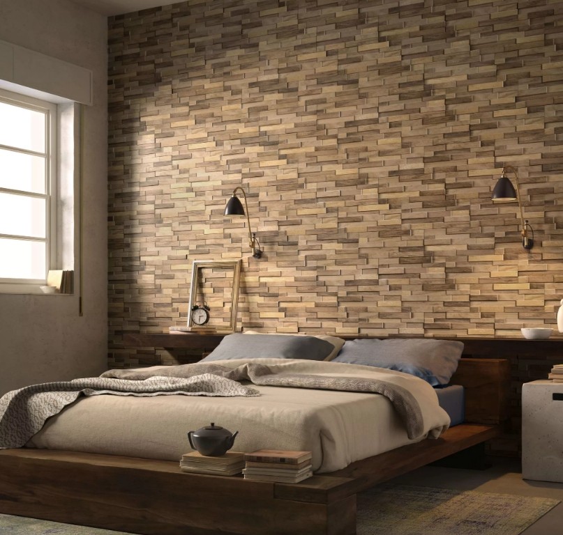 - Например, в спальне можно декорировать ею изголовье кровати, выложив красивое панно из прямоугольных, с рельефной поверхностью элементов. Это не только привнесет в интерьер особый шик, но и создавая в помещении особый уют, способствующий расслаблению.