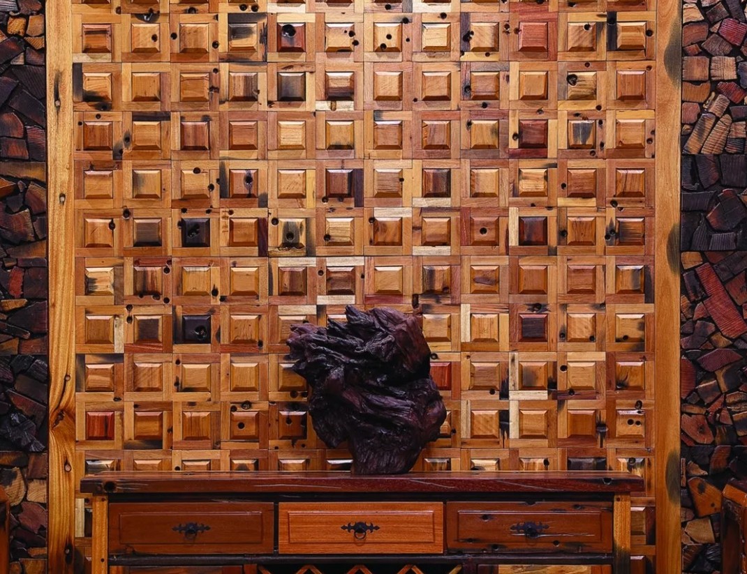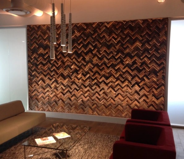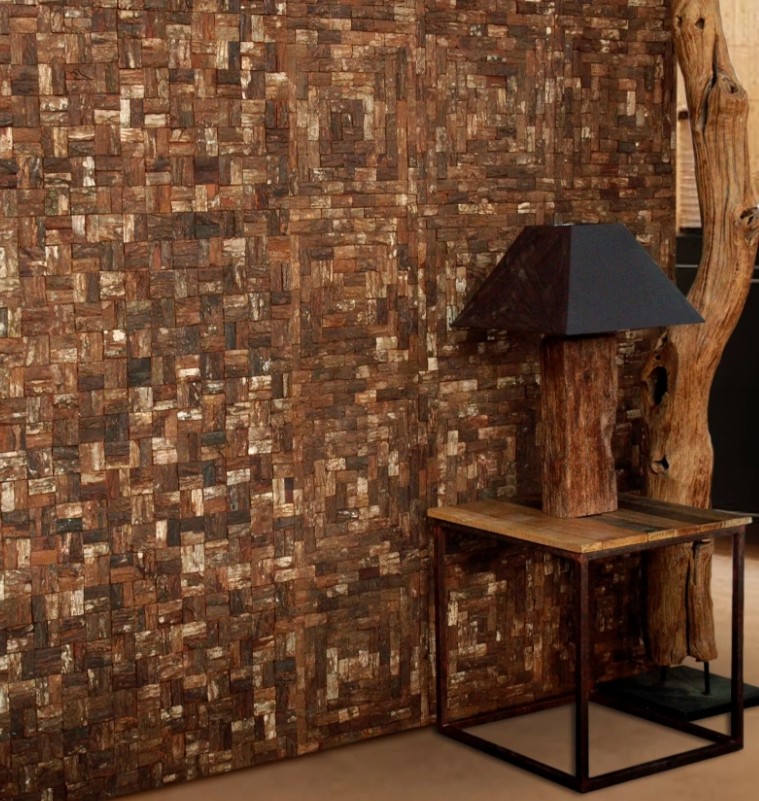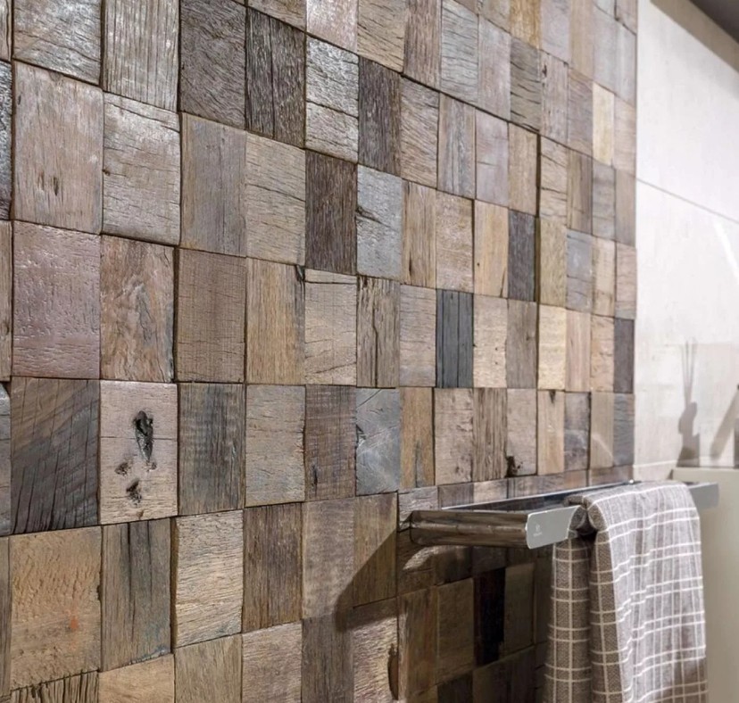 Также в производстве могут применять и амбарную доску, которая поддается предварительной термообработке и просушивается. В процессе создания на поверхности мозаики применяют только деревянный массив, размещаемый под определенным углом. При этом производители могут применять самые разные текстуры и оттенки, создавая уникальные и неповторимые узоры.