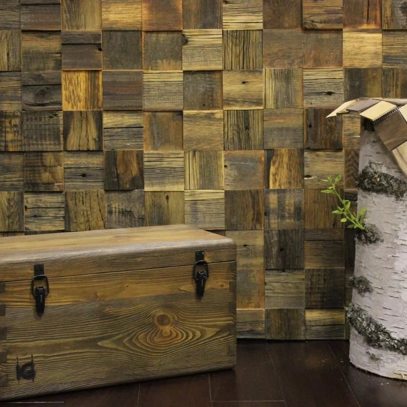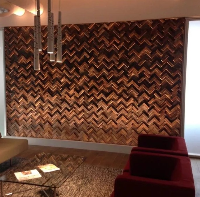 Также в производстве могут применять и амбарную доску, которая поддается предварительной термообработке и просушивается. В процессе создания на поверхности мозаики применяют только деревянный массив, размещаемый под определенным углом. При этом производители могут применять самые разные текстуры и оттенки, создавая уникальные и неповторимые узоры.