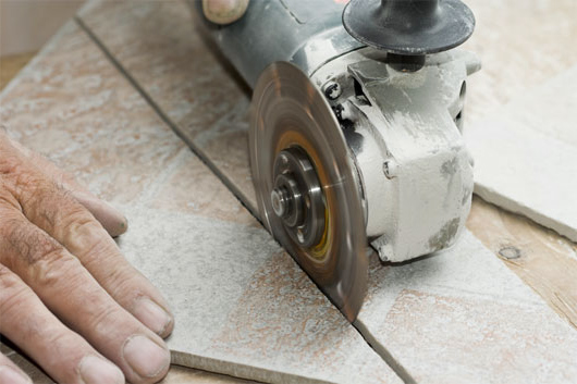 Как резать у керамогранита плитку в таком случае? Придется запастись диском с алмазным слоем для работы по сухому способу. При таком варианте образуется много пыли. После проставления отметки на элементе, его кладут на фанерную подложку или лист ДСП, который не позволит испортить половую поверхность или столешницу. Плитку фиксируют, и появляется шанс придерживать ее обеими руками.
