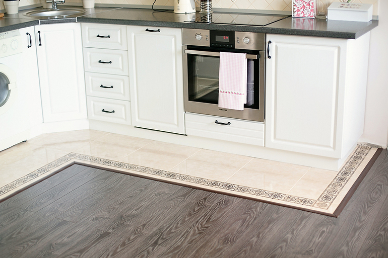 Именно поэтому для кухни лучше применять прочное керамическое покрытие, но если она большая? Вы можете сделать весь пол и фартук из плитки, но будет это выглядеть весьма уродливо, да ещё и дорого выйдет. Лучше совместить два описанных покрытия на полу с помощью способов, которые мы опишем ниже. Так вы выиграете максимальную выгоду от ремонта, не потеряв во внешнем виде помещения или в качестве материалов. Но отметим, что ламинат нужно будет использовать только там, где будет планироваться только спокойна обстановка со стандартными условиями, без агрессивных факторов (попадание влаги, грязи, пара). Если вы хотите постелить его там, где будет проходить прием пищи, то проблем в дальнейшем никаких не возникнет. Но если вы собираетесь размещать его рядом с плитой или раковиной, то, возможно, его срок эксплуатации уменьшится.