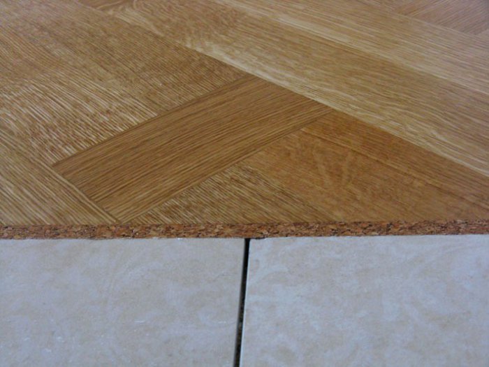 Самый сложной, но и самый красивый и презентабельный способ состыковать поверхности плитки и ламината — использовать пробковый компенсатор. Это натуральный материал, который требует очень ровного шва, так как его необходимо вплотную загнуть между стенками материалов. Кроме того необходимо будет обработать срезы плитки и ламината, чтобы компенсатор вошел ровно. Очень часто бывает при работе с компенсатором, что он неровно входит в стык, так как высота материала не везде одинаковая. Внимательно следите за этим моментом, чтобы не пришлось проделывать всю работу заново.