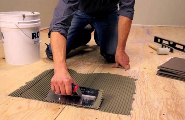 Применение цементного клея в ванной под напольную плитку также возможно, но при значительном весе листов керамики слой раствора во избежание проседания не должен превышать 1 см.