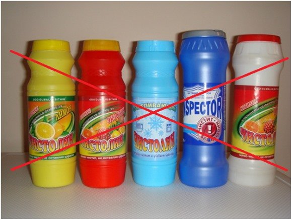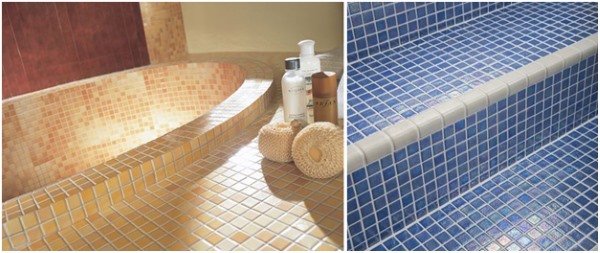 Используя для облицовки ванной стеклянную мозаику или плитку, при чистке отделки нужно исключить применение агрессивных составов с высокой концентрацией кислот или щелочей – они исказят цвет стекла. Кроме того, категорически запрещено смешивать между собой кислотные и щелочные составы.