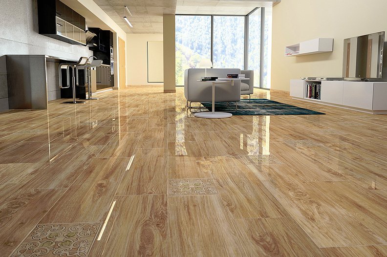 - за счёт полировки глянцевая плитка, уложенная на пол, отражает свет, что визуально увеличивает размеры комнаты;