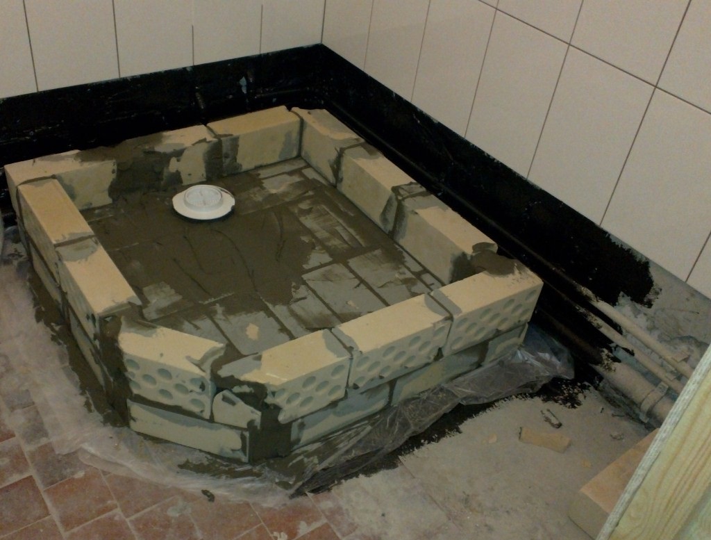 Преимущества поддона для душа из плитки ясны, но облицовка будущей кабины является завершающем этапом строительных работ, а из чего сделать само приспособление? Для создание конструкции лучше всего в данном случае подойдут такие материалы, как бетон или кирпич. Их можно использовать как в загородном доме, так и в городской квартире. Главное — помнить о необходимости гидроизоляции пола под будущей кабинкой, основания и стенок самого поддона, а также создании правильного стока, чтобы вода свободно уходила и не застаивалась.