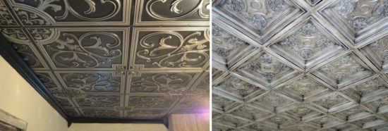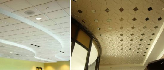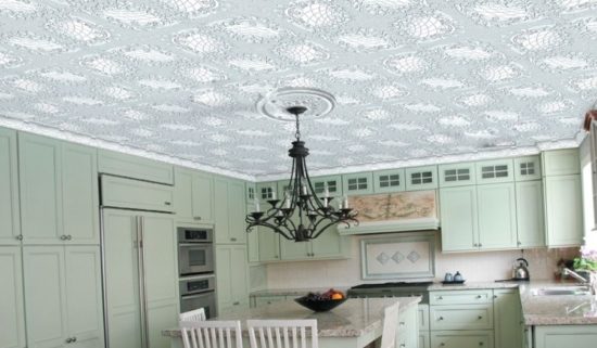 В более сложных случаях, когда на потолке есть люстра, и начинать облицовку нужно от неё, или потолок имеет сложную конфигурацию, на основании выполняют разметку компоновки плитки — для этого сначала присматривают облицовку в магазине, чтобы знать её размеры.