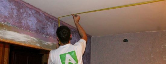 Точнее всего получится сделать эти замеры под потолком, прикладывая концы рулетки вплотную к стене, так как перегородки могут иметь отклонения от вертикали. Для этого при выполнении измерений нужно стараться, чтобы рулетка быть перпендикулярна стенам, к которым прикладывается, иначе замер окажется завышенным, а это даст и увеличение расчётной площади потолка.