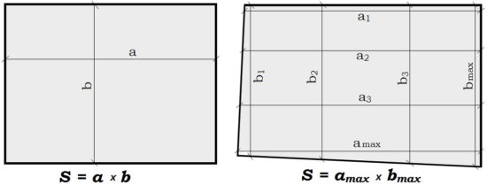 В помещении прямоугольной формы площадь потолка (S) определяют перемножением его длины (a) на ширину (b) в метрах, после чего полученный в м кв. результат округляют вверх до целых единиц.