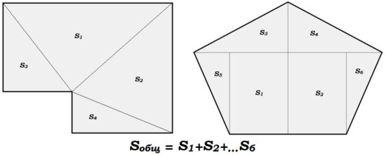 Бывает, что помещение имеет более сложную, чем прямоугольник, конфигурацию – например, углов больше, чем 4. В таких случаях потолок разбивают линиями на простейшие составляющие (прямоугольники, треугольники), рассчитывают площадь каждой из них по геометрическим формулам и суммируют значения.