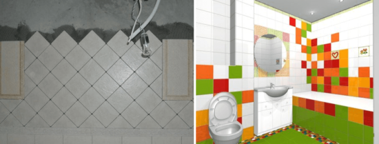 При художественной раскладке, выполняющейся из разных видов керамики, на стенах выполняется разметка монтажа плитки согласно дизайн-проекта. Для этого используют образцы кафеля, подобранного заранее.