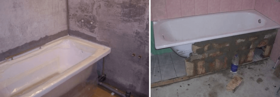 Ванну вновь устанавливают по месту и задвигают бортами в штробы, после чего замазывают раствором оставшиеся щели заподлицо стене.