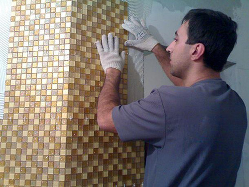 До того, как укладывать мозаичную плитку, обмазывают её клеевым составом. При этом на полотно наносят раствор посредством гладкой подошвы шпателя. Толщина клеевого слоя не должна быть чересчур большой, чтобы смесь не выходила за границы швов. Главный принцип нанесения клеевой смеси — равномерность. После чего элементы облицовки накладывают на основу. Тут уместно пользование металлической гладилкой, резиновым валиком либо деревянным брусочком.